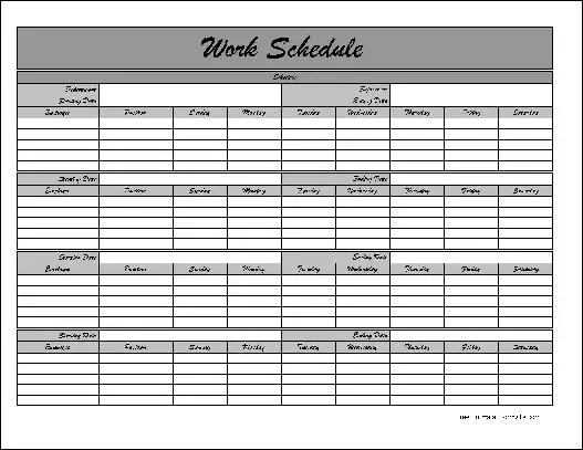 Form Description: One of the most important aspects of running a business is letting your employees know when they need to be in for work. While you can always try to do this by shooting from the hip, that isnβt very efficient, or very fair to your employees. Instead, use this Monthly Work Schedule to help you pass on this important information to your employees for up to a month at a time. Who said that business paperwork needs to be boring? Why not show a bit of elegance and fun with this particular edition of the Monthly Work Schedule which uses a fancier typeface than normal. This typeface will allow you to have a bit more fun, but also add a touch of elegance to your business paperwork.