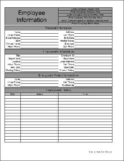 Formville's free "Personalized Employee Information Form " form is associated with the following keywords: Personnel, history, information, employee, log, human resources, personalized.